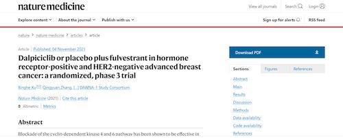 11月4日,国际四大医学期刊之一、英国《自然》旗下《自然医学》(Nature Medicine)在线发表CDK4/6抑制剂达尔西利(SHR6390)联合氟维司群治疗既往内分泌治疗后疾病进展的HR+/HER2-晚期乳腺癌的多中心、随机、双盲III期临床研究(DAWNA-1研究)中期分析结果报告,首次对氟维司群(雌激素受体降解剂)±达尔西利治疗激素受体阳性晚期乳腺癌的有效性和安全性进行了比较。研究结果显示,达尔西利+氟维司群组与安慰剂+氟维司群组相比,无进展生存期(PFS)显著延长。该项研究由中国医学科学院肿瘤医院徐兵河教授担任leading PI,全国39家医院参研,由918博天娱乐临床研发团队支持完成。